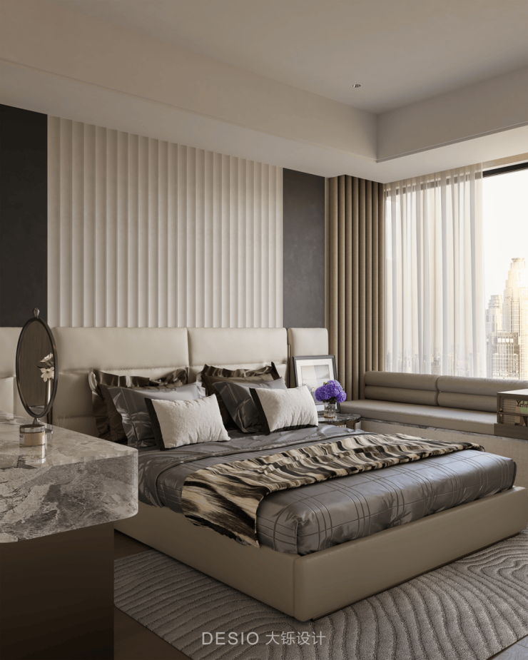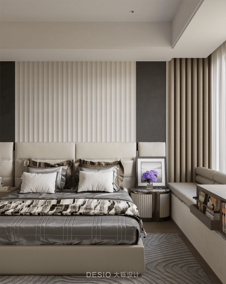 大尺度飘窗搭配轻薄的纱帘与遮光窗帘,既能引入充足自然光线,让空间明亮通透,又可根据需求调节光线与隐私。床品选择带有光泽感的面料,搭配造型简约的床具,彰显出轻奢的品味。
