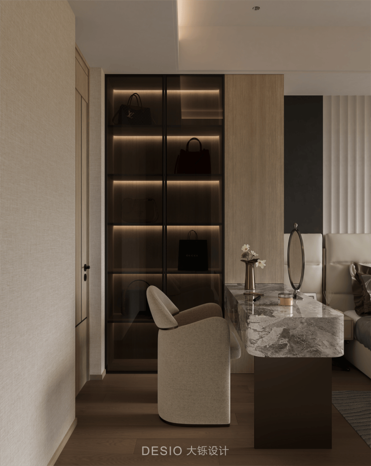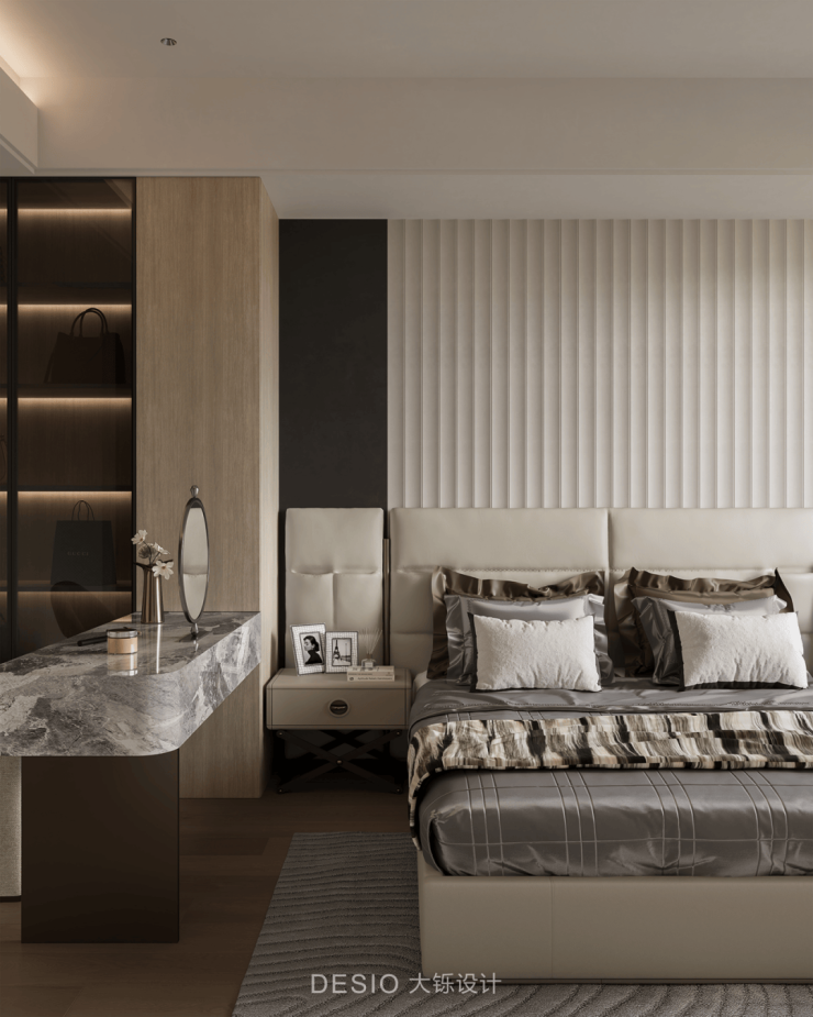 The bedside table is simple and practical, with photo frames and bouquets placed on it, infusing the space with a sense of life and art. The dressing and hat area is ingeniously divided by the dressing table and the sleeping area, ensuring visual transparency and spatial extension, presenting a modern bedroom scene that is minimalist yet retains the tension of details.