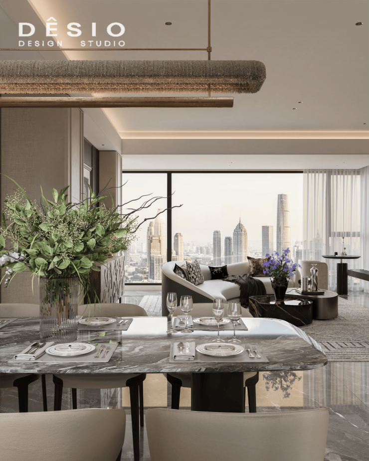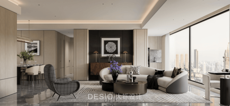 客厅空间以大面落地窗引入充沛自然光线,城市天际线成为室内最具张力的背景,赋予空间开阔与通透感。