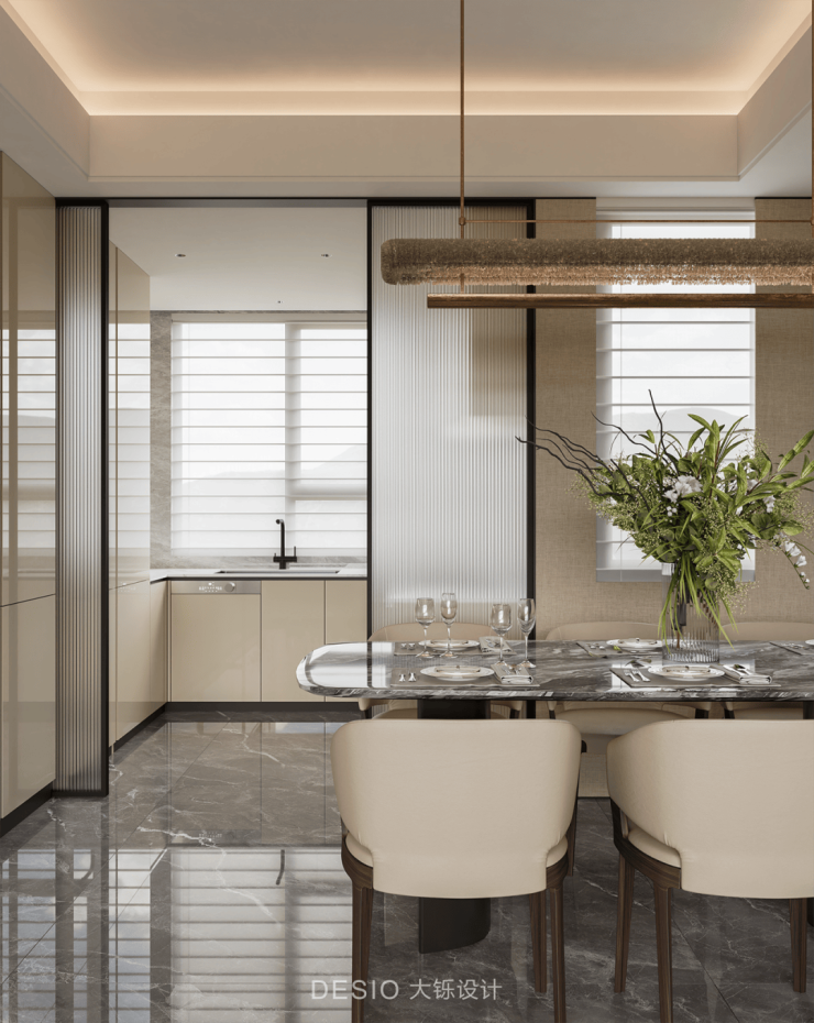 整体配色以中性奶油调为基底,辅以黑、灰、棕的对比,展现低奢质感;而简洁的吊顶灯带与高光石材地面,则在光影交织中放大空间气场,塑造出一个既精致大气又富有生活温度的都市会客场景。
