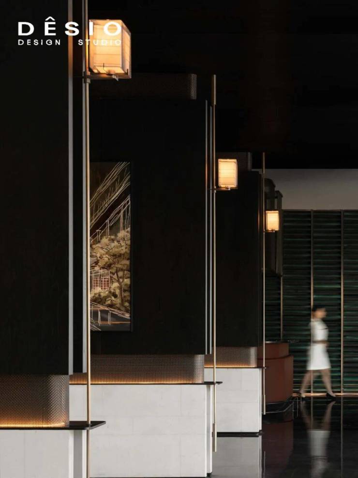 The overall color scheme is based on a neutral cream tone, complemented by the contrast of black, gray and brown, presenting a low-luxury texture. The simple ceiling light strips and high-gloss stone floor, in the interplay of light and shadow, amplify the spatial atmosphere, creating an urban reception scene that is both exquisite and grand as well as full of the warmth of life.