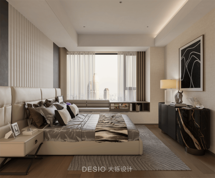 The master bedroom space exudes the beauty of modern light luxury. The overall color tone is mainly soft off-white and light brown, complemented by dark decorative cabinets and abstract wall hangings. With simple lines and strong color contrasts, it becomes the visual focus of the space, creating a balanced and layered visual effect.