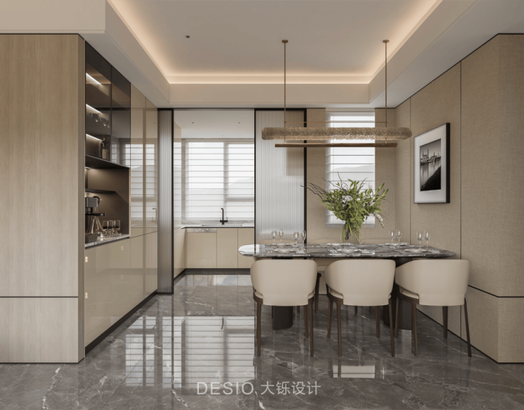 餐厅空间整体以低饱和度的暖色调为主,营造温馨舒适的氛围。与厨房区域形成半开放的互动关系,既保证了烹饪操作的便利性,又让用餐空间能共享厨房的采光与通透感。