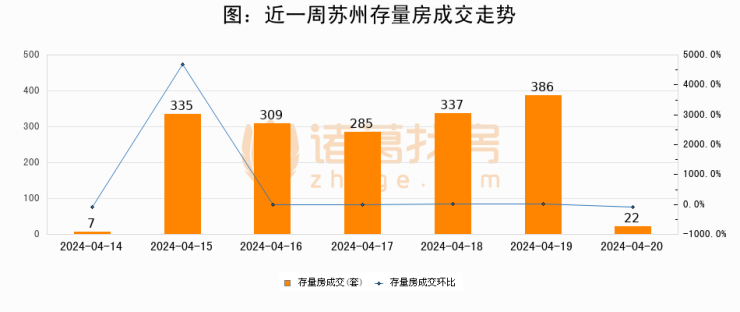 从存量房来看,2024年04月20日苏州存量房单日成交22套,比昨日减少364套,环比下降94.3%。从近一周存量房成交来看,苏州存量房日均成交套数为240套,04月20日单日成交22套,低于近一周平均水平90.8%。