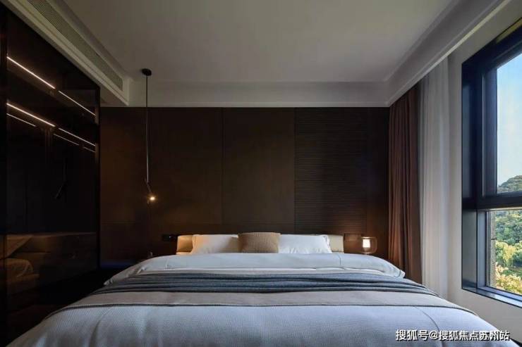 艺术感不仅体现在空间环境的营造,细节的处理和材质的选择也透漏出时尚气息。大气中又不失生活的趣味。皮质有纹理的软包,无主灯的设计,每一处细节都体现着轻奢感。地毯、床品和吊灯的相互映衬,营造出自然舒适的空间氛围,增添了卧室的温暖气息。