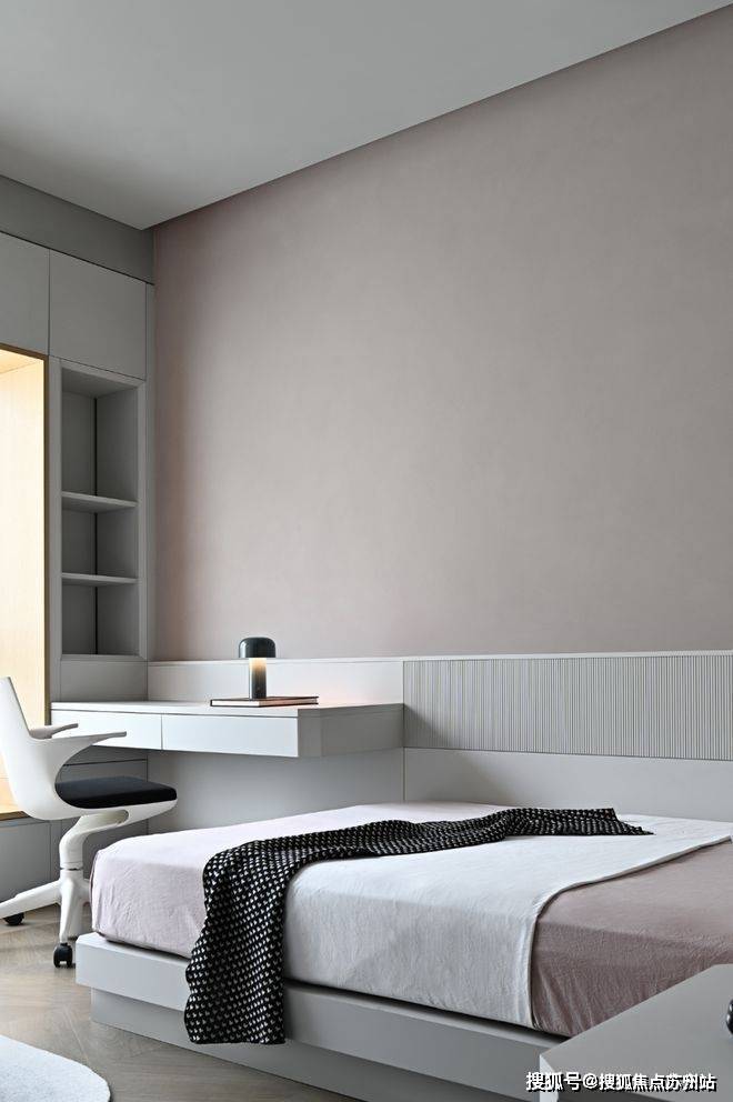 儿童房注入了莫兰迪粉色,简约形态的学习桌和书架很实用,同时不压缩孩子的活动空间。空间整体布局隐含着对孩子的尊重与期待,也藏着润物细无声的关怀。