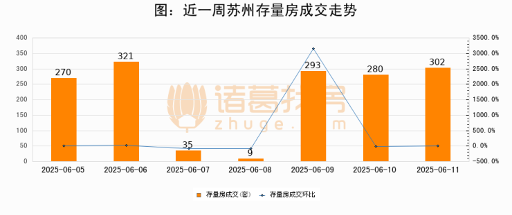 从存量房来看,2025年06月11日苏州存量房单日成交302套,比昨日增加22套,环比上涨7.9%。从近一周存量房成交来看,苏州存量房日均成交套数为215套,06月11日单日成交302套,高于近一周平均水平40.5%。
