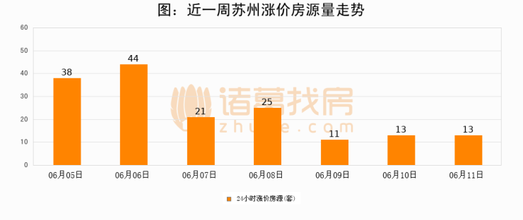 根据诸葛找房数据显示,苏州24小时涨价房源量为13套,较06月10日持平。