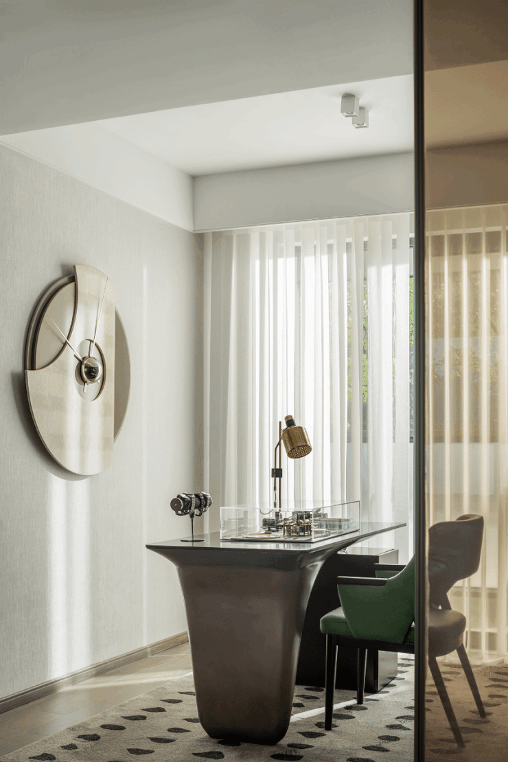 书房大幅窗面引入自然光线,室内外皆是风景。植物、光影的四季变化不受间隔,同步生长,与室内的材质、纹理、色彩、装饰精妙组合,自在有趣。