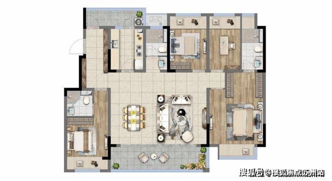 同时由于楼层低、一梯两户,使房子公摊面积变少,且四个卧室都带有飘窗,所以该户型实用面积多,户型尺度感非常足。