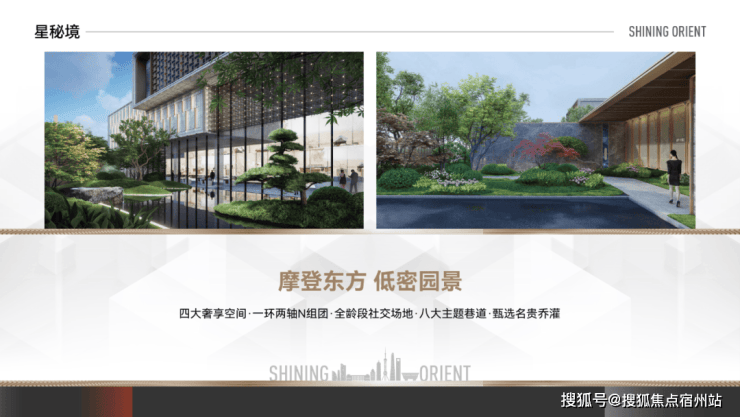 项目整体以摩登东方为核心造景理念,营造一环两轴N组团的景观布局,将花草、树木、流水、山石、景墙编织成序曲语言,在浮躁与喧嚣的城市中,用宁静温润的语言将摩登东方的惬意美好娓娓道来。