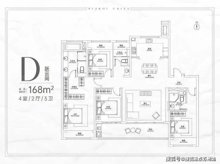 南向四开间,约5.1米大横厅,连接约8.1米阳台。主卧套房设计,带步入式衣帽间和明卫,6个飘窗设计。