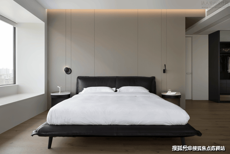 卧室另一侧分别设计为更衣室和浴室,深棕色的隔断墙点明了恰适的隐私尺度,也在视觉上遮挡住两个区域之间的间隔。