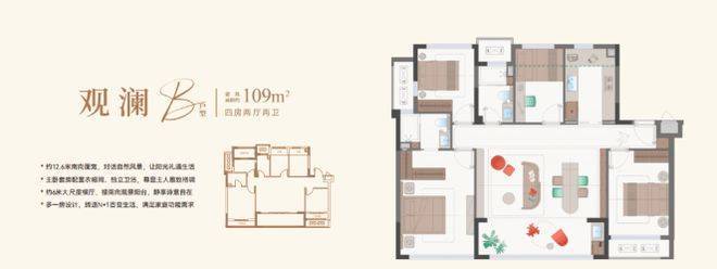 樾澜铭院售楼处营销中心:400-8828-814樾澜铭院售楼处电话/地址☎:400-882-8814(开发商热线)建面约109㎡户型,4房2卫,整体约12.6米南向面宽,约6米大尺度横厅,尺度感和功能性进一步增强。