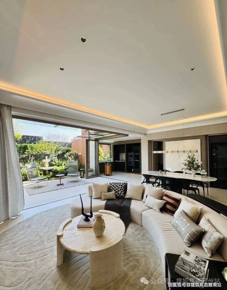 「无界空间」:客厅270度转角无柱设计,搭配落地玻璃,开阔视野将院中风景迎入日常。