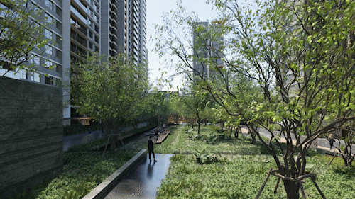 社区将围墙隐藏于沿街商业和办公背后,以更开放的姿态链接城市,如同镶嵌于繁华版图里的一块“静谧生活拼图”。