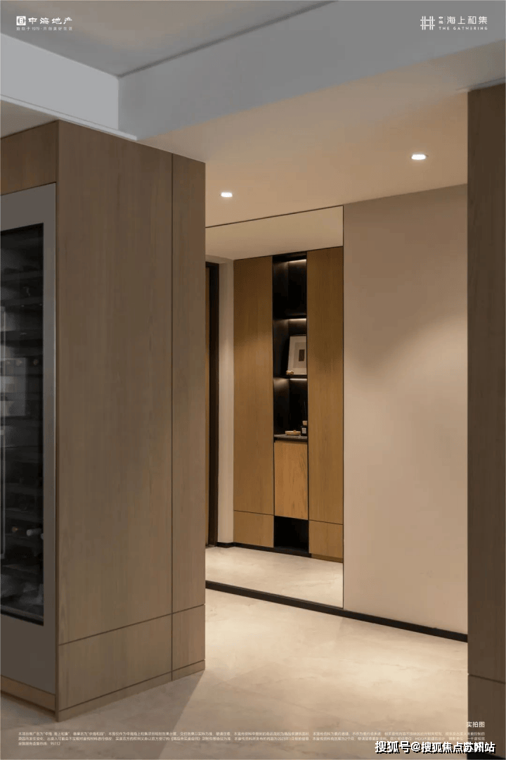 约4m长的玄关过道,轻松装下日常出门所需的一切,针对不同的物品进行分类收纳,并预留有紫外线灭菌装置及插座点位。一整面的镜面墙体,让整个空间显得更开阔。