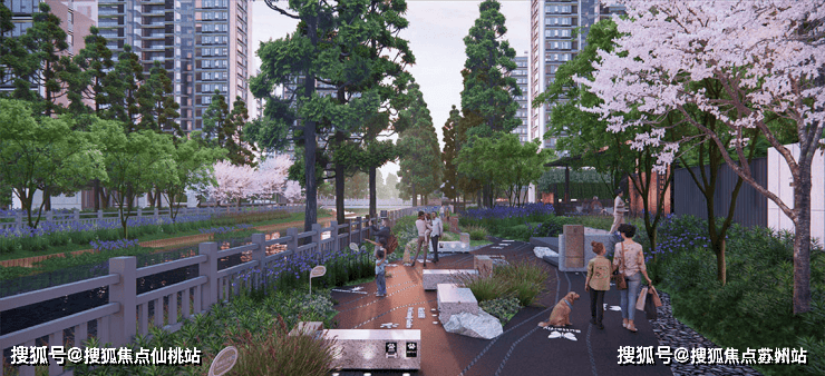 滨水活力轴是通过借景的形式,与水岸内外连通,两岸轴线分布滨水步道,植入了万物友好理念,可以承载散步、遛狗、休闲等户外生活方式。