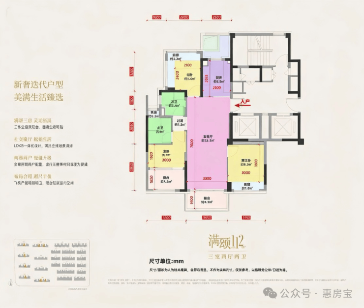 ①112户型,3房2厅2卫,两梯两户。三开间朝南,南侧双阳台;
