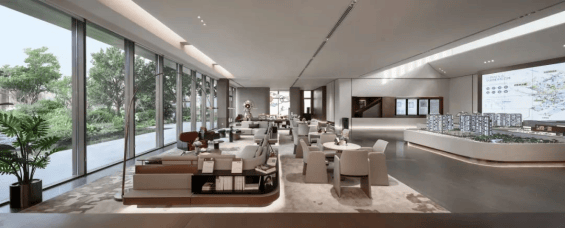 设计师以“融合”为设计理念,将现代建筑工艺和当代艺术感的室内风格相映衬,传统与未来在此融为一体;恢弘的爱达城展陈于中心沙盘,将脑海中“TOD城市综合体”的概念彻底具象化;体验馆内,精心设计的咖啡吧、儿童空间,则是爱达城质造美好生活的缩影。