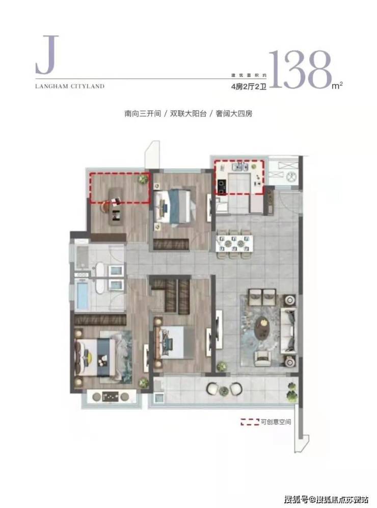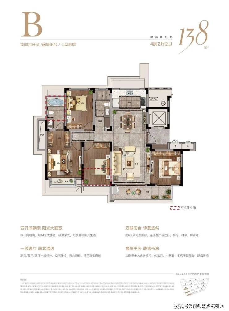 建面约138㎡四室二厅二卫:客厅与次卧共享约6.4米的跑道式双阳台。主卧走入式衣帽间以及预留浴缸位,整个洋房户型的得房率约90%,空间利用率非常高。约14.2米的超大南向面宽,让整个室内通透明亮。串联起客厅和次卧的阳台,长约6.4米,摆上一排绿植,莳花弄草的诗意日常在家就能实现。禹洲泊朗廷售楼处电话:400-8787-554☎