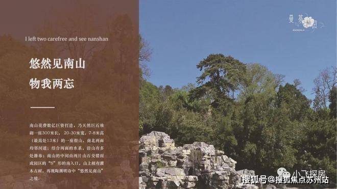 Ilefttwocarefreeandseenanshan悠然见南山物我两忘南山花费数亿巨资打造,乃天然巨石堆砌一座300米长,20-30米宽,7-8米高(最高处13米)的一座假山,南北两面均邻河道;结合两面的水系,沿山有多处瀑布;南山的中间由两片山石交错而成园区的“S”形的南入口,山上植有灌木古树,再现陶渊明诗中“悠然见南山”之境。