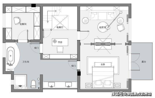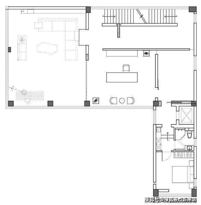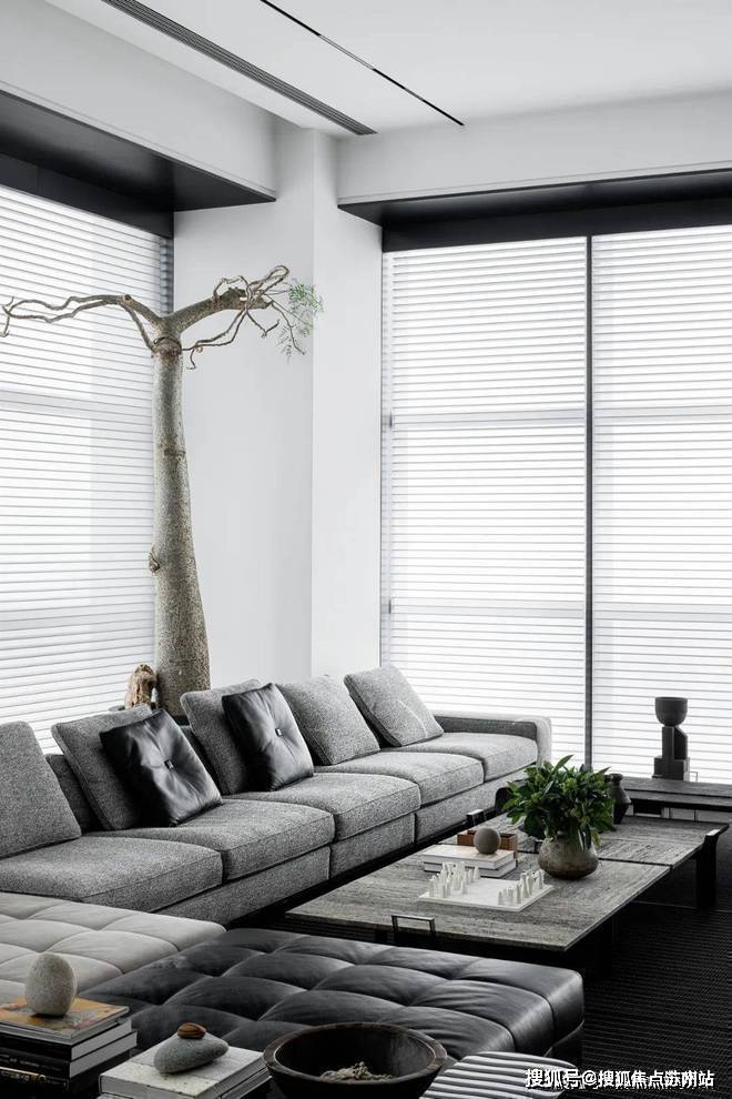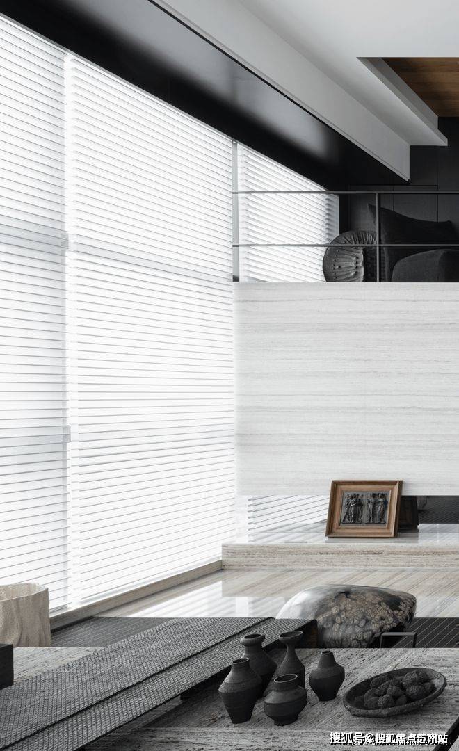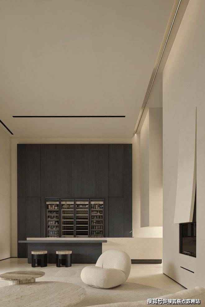 空间是光影的容器,自然光穿透白色的纱帘给会客厅加了一层摩登的滤镜。两侧纱帘光影通透,暗香浮动,几丝波影乍如烟。一处吧台,临烟火,酌清欢。烟火清欢,一半一半。