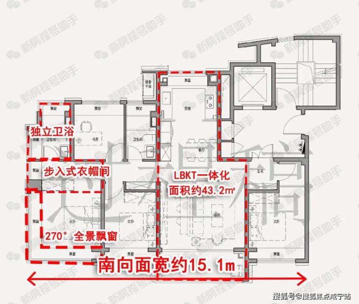1、空间革新:四开间朝南,南向面宽高达约15.1m,采光面充足,景观视野开阔!LDKB一体化设计尺度奢阔!面积达约43.2㎡!超广阳台采光及通风效果MAX!年轻父母用嵌入式烤箱准备Brunch,老人在阳台晒太阳听鸟叫,孩子趴在腿边畅想未来