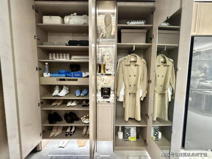 1、收纳满分:入户玄关柜+“S”墙的设计,依旧是超级收纳系统具象化!特别是日常外套等次净衣物收纳方面,特地做了高柜格局+挂衣杆,细节拉满!