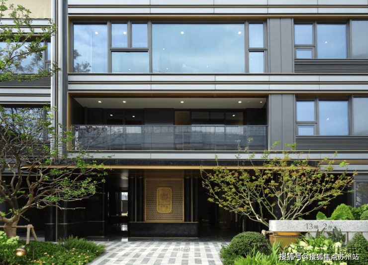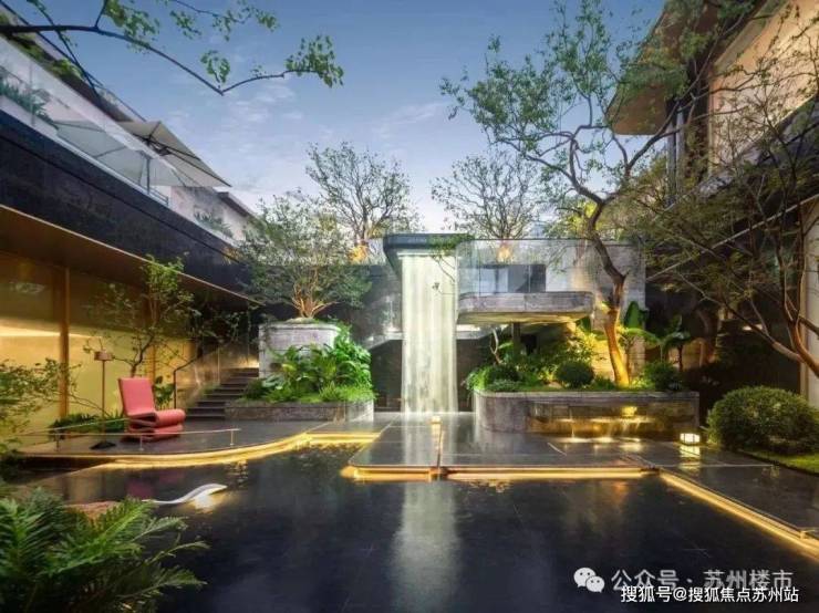 约5米高悬挑飞瀑添灵动,搭配羽毛枫等多层次绿化与镜面树池错层平台,完全跳出传统改善盘的堆叠感,有种在酒店度假的松驰感。