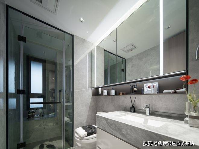 在卫生间,主卧镜柜内置美妆冰箱,方便女主人储物各种面膜,化妆品等物件。