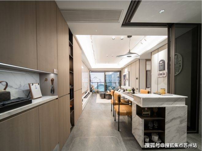 全屋墙布交付,甚至连局部免漆木饰面格栅+仿大理石岩板也是交付标准,诚意之高见微知著。