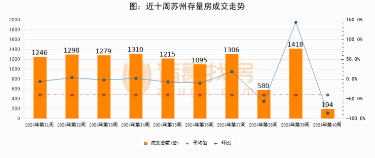存量房方面,第40周苏州存量房成交194套,较上周减少1224套,环比下降86.3%。从近十周成交走势来看,周均成交套数为1094套,本周低于平均水平82.3%。