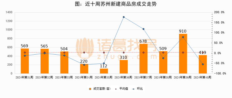 进入2024年第40周(09月30日-10月06日),苏州新建商品房成交419套,较上周减少491套,环比下降54%。从近十周成交来看,周均成交套数为479套,本周成交419套,低于近十周平均成交量12.5%。
