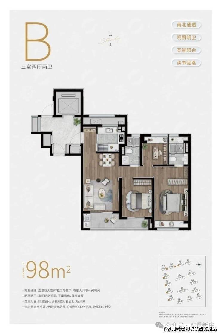 B户型:建面约98㎡3房2厅2卫▼陆家嘴.锦绣云澜售楼处电话:400-8228-664售楼处电话✔✔