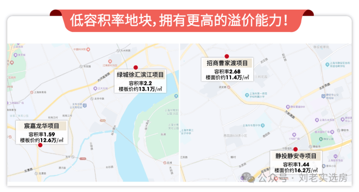宸嘉龙华项目,容积率1.59,可售住宅楼板价约12.6万/㎡,楼板价直逼徐汇滨江的绿城项目;静投静安寺项目,容积率1.44,可售住宅楼板价约16.2万/㎡,楼板价远超曹家渡的招商项目不难发现,低密地块拥有非常强劲的溢价能力!