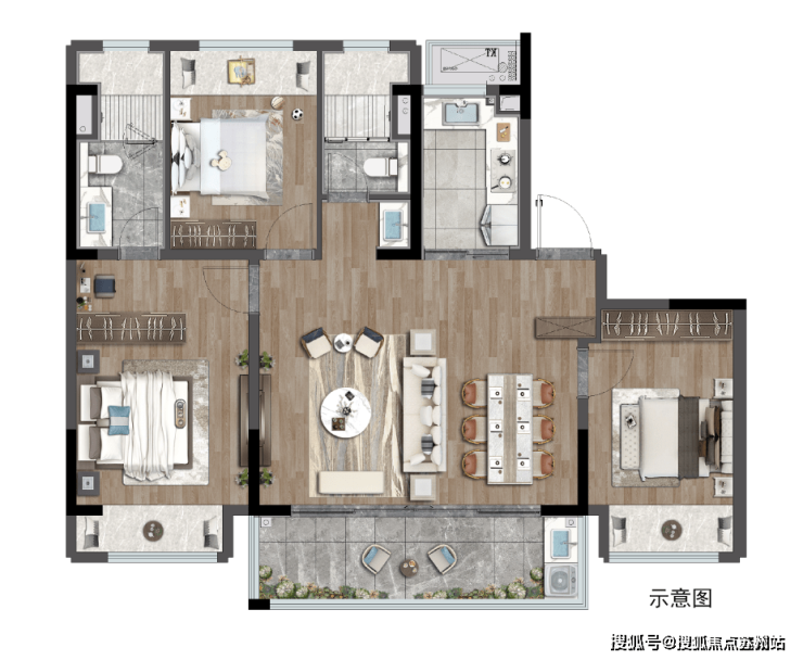 建面约122㎡ 的3房2厅2卫是项目的最小户型,也是该项目唯一的三房户型,做了大三房的设计。