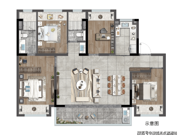 建面约129㎡的4房2厅2卫是项目面积最小的四方户型,做了紧凑四房的设计,适合二胎或者三代同堂的家庭。