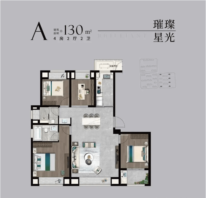 项目主力为四居室改善户型,得房率76-88%,具体配置如下: