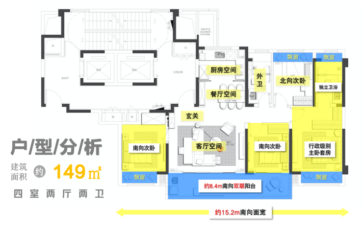 四开间朝南,约15.2米南向面宽+约5.4米超大横厅+约8.4米双联阳台,形成开阔通透的公共活动区;LDKB一体化巨厅,形成家庭社交核心,满足多元场景需求。