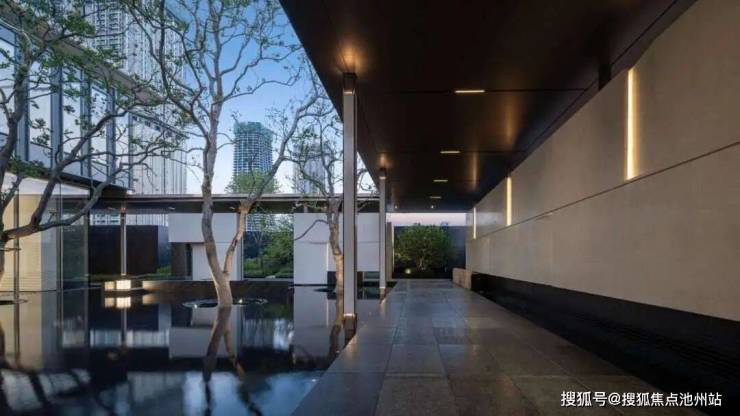 悬崖会客厅廊架地面采用安哥拉黑 3.6m×1.8 m×0.3m 大板铺贴,施工难度极大,需 8 人协作抬运并配合机械作业,最终呈现出大板面的优质效果。会客厅廊架采用昂贵蜂窝不锈钢大板,大气且保证平整度,以高品质材质与精湛工艺,进一步提升空间的质感与格调。