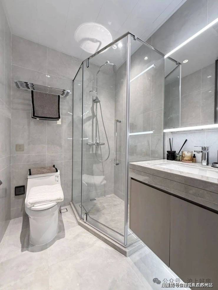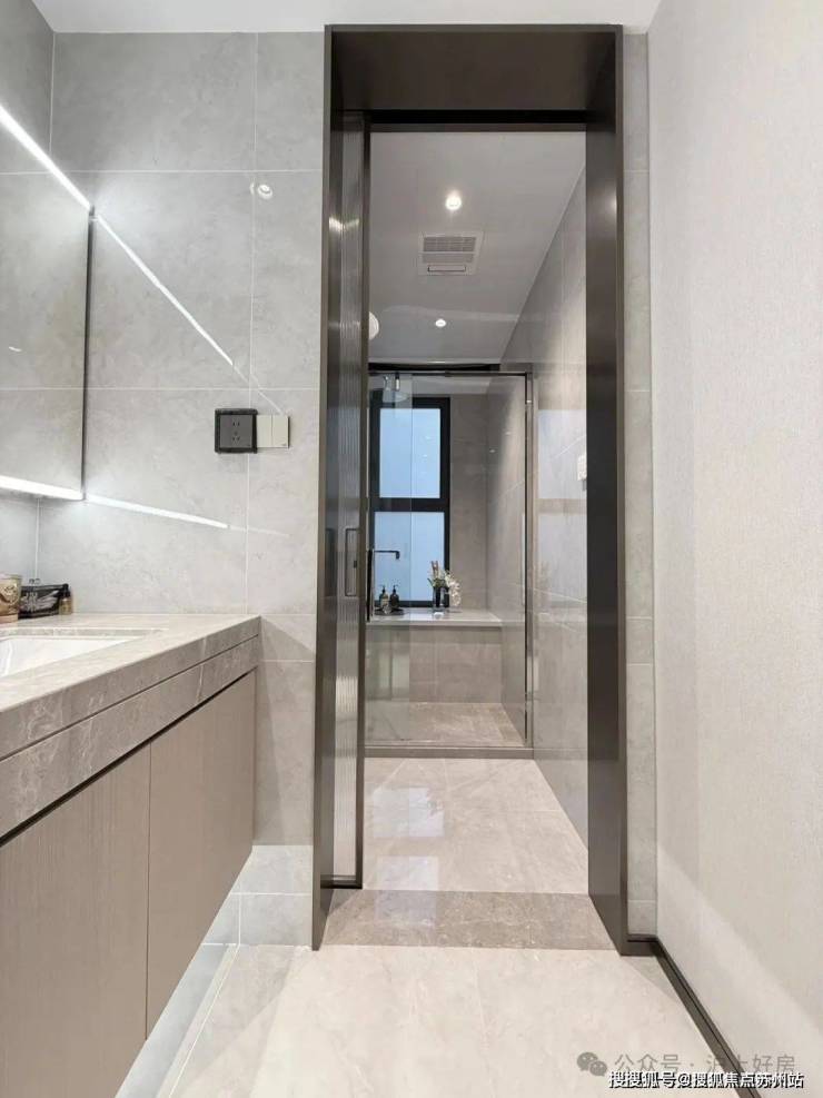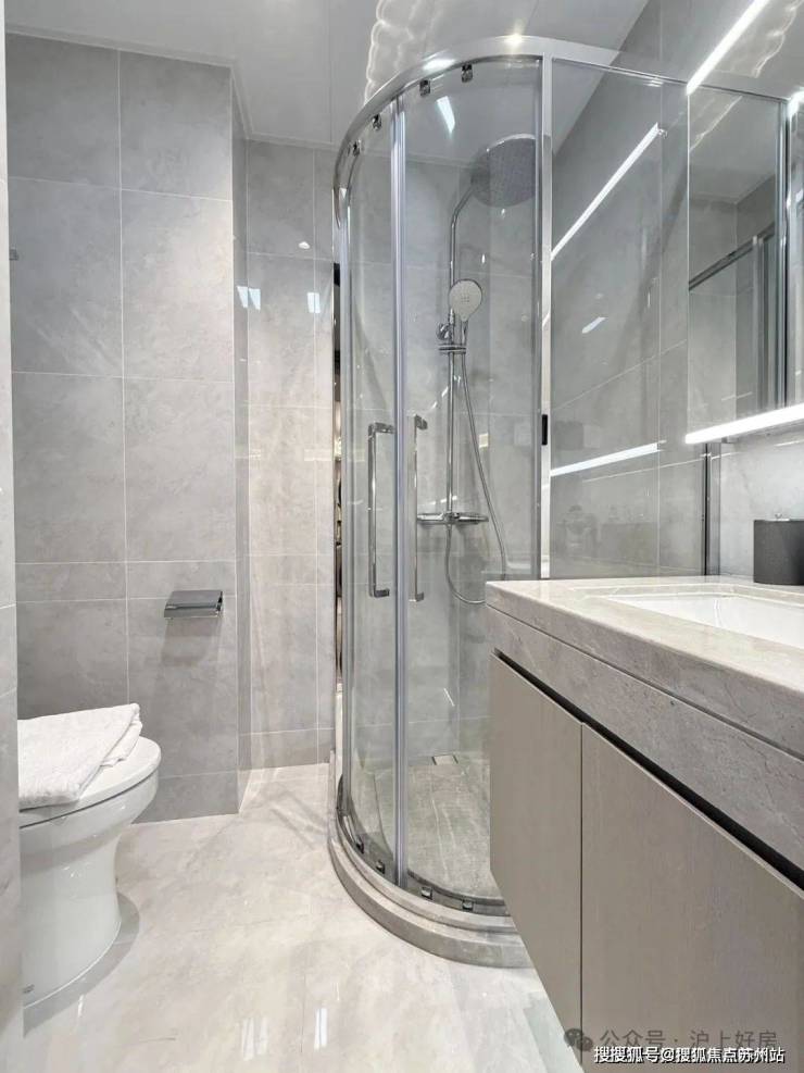另外,一般百平米主卫淋浴房都是钻石型的,但项目是“一字型”的。“一字型”相比“钻石型”,洗澡空间更大,哪怕带着小朋友也不用挤得“转圈圈”,舒适度提高了不止一点点。