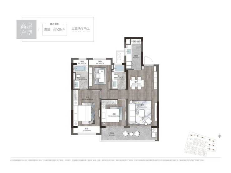 高层105㎡,三室两厅两卫,功能齐全,性价比高。