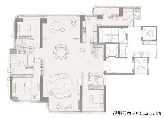 整个户型十字中轴的布局,方正无比的格局,卧室全套房的设计,27米的南向面宽……无论是功能性还是尺度感都足以承载一个大家族的居住和传世需求!