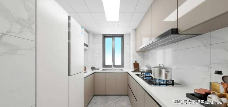 厨房为U型布局,配置定制橱柜、老板烟灶、林内热水器,台面为人造石,水槽为邦克台下盆,细节处体现人性化考量.