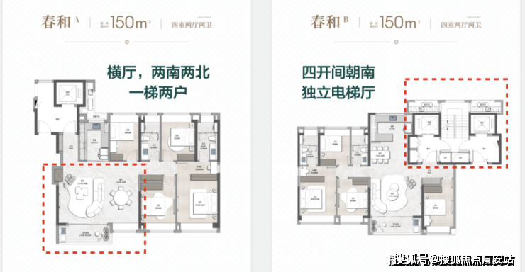 建面约150㎡4室2厅2卫户型,整体尺度上更为宽绰,