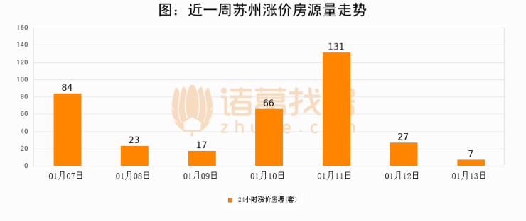 根据诸葛找房数据显示,苏州24小时涨价房源量为7套,较01月12日减少20套,环比下降74.1%。与此同时,涨价房源占比小幅回落,对于购房者来说是一个入市窗口期,购房者可抓住时机入市。