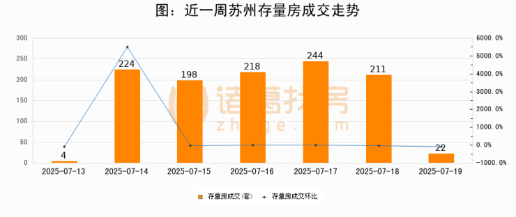 从存量房来看,2025年07月19日苏州存量房单日成交22套,比昨日减少189套,环比下降89.6%。从近一周存量房成交来看,苏州存量房日均成交套数为160套,07月19日单日成交22套,低于近一周平均水平86.2%。
