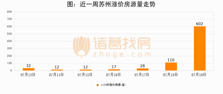 根据诸葛找房数据显示,苏州24小时涨价房源量为602套,较07月18日增加492套,环比上涨447.3%。与此同时,涨价房源占比小幅扩大,业主信心有所提升。
