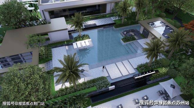 与摩登水院相连的是定制级热带景观泳池,援引度假酒店设计理念,泳池旁选种6棵“热带贵族”加拿利海枣树,并用肾蕨、大吴风草等热带植物加以渲染,一年四季流转出不同的风景,打造出独特的热带风情。